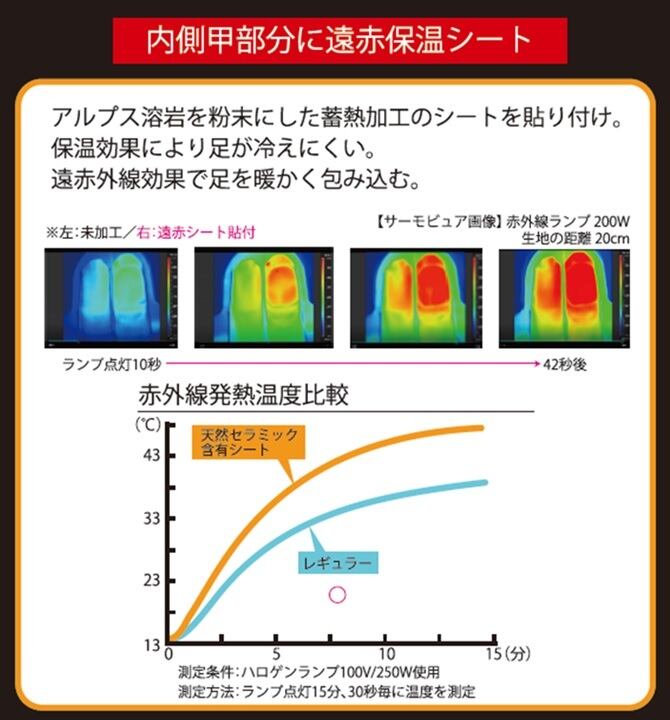 アルプス溶岩を粉末にした蓄熱加工のシート(遠赤保温シート)を靴下の内側の、